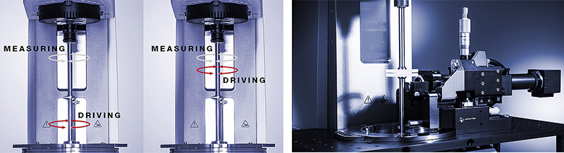 在反向運(yùn)動(dòng)模式下,流變儀將兩套空氣軸承 EC 馬達(dá)均用作驅(qū)動(dòng)裝置和扭矩傳感器。兩個(gè)馬達(dá)可以輕松設(shè)置為以相反方向旋轉(zhuǎn),這可以用來在測量樣品中形成固定的停滯面,以便采用顯微鏡進(jìn)行剪切條件下材料的先進(jìn)結(jié)構(gòu)分析。此模式也可以與通用拉伸夾具結(jié)合使用,以便在最小的測量扭矩下進(jìn)行拉伸測量。就速度而言,反向運(yùn)動(dòng)模式更讓測量工作“事半功倍” — 最高速度差高達(dá) 6000 rpm,這大大拓寬了高剪切應(yīng)用的剪切速率范圍。
