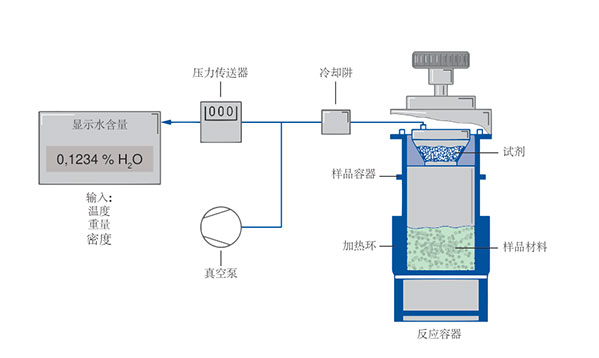 水和氫化鈣在氫發(fā)展過程中根據(jù)以下反應(yīng)方程式相互反應(yīng):CaH2+2H2O→Ca(OH)2+2H2 該反應(yīng)發(fā)生在 AQUATRAC-V 中的一個封閉容器,即反應(yīng)容器中。使用內(nèi)置真空泵在測量前將其排空,并在測量期間對其進(jìn)行電加熱。加熱釋放的水蒸氣與氫化鈣反應(yīng),由于氫的生成,測量系統(tǒng)中的壓力增加。氣體壓力與引入的水量成正比,因為反應(yīng)是針對水的。氣體壓力是該方法的測量變量。計算壓力與樣品重量之比,結(jié)果以% ppm 和mg水含量表示。其他揮發(fā)性物質(zhì)在室溫下被冷凝在冷卻阱中,因此不參與測量。因此,這是一種專門用于水的絕對測量方法——如 DIN EN ISO 15512:2019 中所述,即方法E——用氫化鈣法測定水含量。