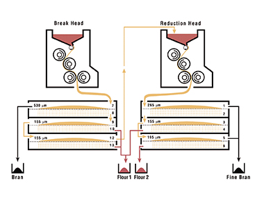 • 同時(shí)得到四種產(chǎn)品:①皮磨粉 ②心磨粉 ③次粉 ④麩皮