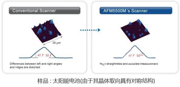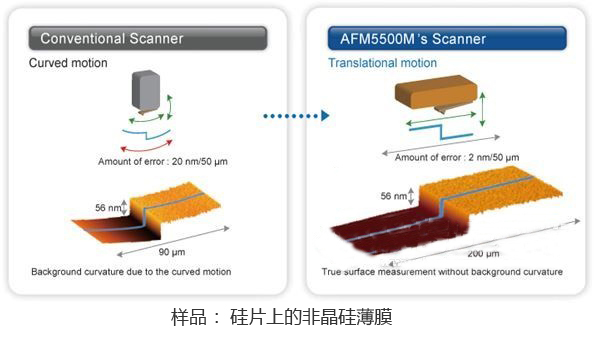 AFM5500M搭載了最新研發(fā)的水平掃描器,可實現(xiàn)不受圓弧運動影響的準(zhǔn)確測試。