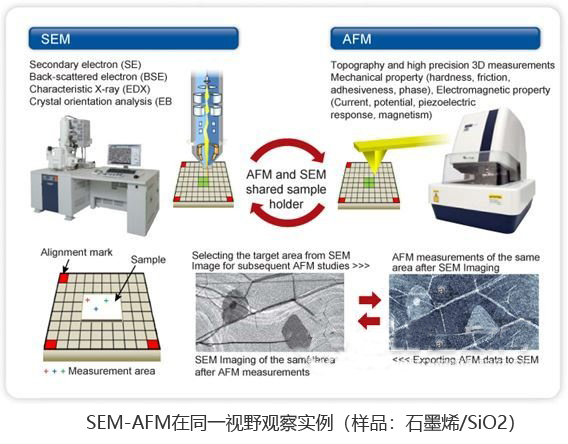 通過SEM-AFM的共享坐標(biāo)樣品臺,可實現(xiàn)在同一視野快速的觀察分析樣品的表面形貌,結(jié)構(gòu),成分,物理特性等。