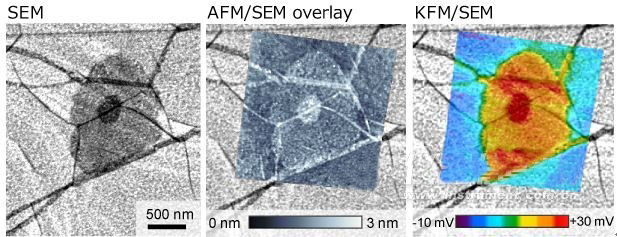 上圖是AFM5500M拍攝的形貌像(AFM像)和電位像(KFM像)分別和SEM圖像疊加的應(yīng)用數(shù)據(jù)。
