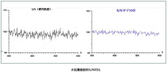 上圖所示是F-7100與F-7000水拉曼散射的S/N對比情況。F-7100靈敏度是前代機(jī)型的1.5倍,即便是微弱的信號,也能實(shí)現(xiàn)低噪聲檢測。