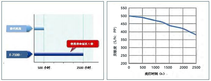 F-7100采用全新氙燈,并改良了燈電源,使得光源亮度提升,并有效延長了氙燈的使用壽命。延長燈泡更換周期可降低耗材成本,減輕燈泡更換等作業(yè)負(fù)擔(dān)(如上左圖)。由如上右圖可知,F(xiàn)-7100性能卓越,即使氙燈使用接近2500h,也能夠維持較高的靈敏度。