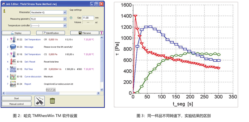 本文使用賽默飛 哈克Viscotester iQ智能流變儀配合 兩種4 葉片的槳葉式轉(zhuǎn)子(FL16 和 FL22)在通用夾持 器上通過控制速率模式進行實驗,轉(zhuǎn)子葉片直徑分別為 16 和 22 毫米,高度分別為8.8 和 16 毫米(圖1),儀 器轉(zhuǎn)速設(shè)置為0.05rpm。5 中市售醬類產(chǎn)品分別使用不 同的轉(zhuǎn)子,采用相同的實驗參數(shù)進行測試。將產(chǎn)品容器 蓋子打開,直接放置在通用夾持器上面。利用手動控制 升降功能和哈克 TMRheoWinTM 軟件設(shè)置(圖 2)以保證 轉(zhuǎn)子保持靜止,然后垂直的將轉(zhuǎn)子插入到具有高度重復(fù) 性的測量位置。實際經(jīng)驗表明,較硬的產(chǎn)品在生產(chǎn)線上 以較高的速度罐裝時,產(chǎn)品在容器內(nèi)的不同區(qū)域可能表 現(xiàn)出不一樣的性質(zhì)。因此每次實驗都必須保證槳葉轉(zhuǎn)子 在產(chǎn)品容器中的位置是相同的,以確保測試結(jié)果的重復(fù) 性和可靠性。當(dāng)樣品經(jīng)過短暫的平衡和恢復(fù)后,測試時 間被重置為 0。然后設(shè)置一個非常低轉(zhuǎn)速(0.05rpm), 旋轉(zhuǎn)的時間以及在此時間段內(nèi)所需要的數(shù)據(jù)點的數(shù)量。 最后可以加入數(shù)據(jù)自動評估的設(shè)置以及生成實驗報告。 實驗報告可以保存為多種格式(比如 pdf,jpeg,tiff 等) 或者直接由打印機輸出。對于每一類樣品,都需要進行 簡單的預(yù)實驗來確定最合適的轉(zhuǎn)子型號。比如較小尺寸 的轉(zhuǎn)子適合測試具備較高屈服應(yīng)力的樣品,比如花生醬; 而尺寸大的轉(zhuǎn)子則適用于測試低粘度、低屈服應(yīng)力的樣 品,例如巧克力醬,果醬或者蛋黃醬 [7]。為了確定合適 的轉(zhuǎn)速,則需要進行多種轉(zhuǎn)速的實驗。轉(zhuǎn)速太高則會在 曲線上形成一個難以計算的尖峰(圖3中紅色三角形),轉(zhuǎn)速太低則會產(chǎn)生漸進型的曲線(圖3 綠色圓圈)。而 我們的目的是選擇一個合適的轉(zhuǎn)速,使得實驗曲線具有 一個可以評估的最大值(圖3 藍色長方形)。前期實驗 證明,0.05rpm 的轉(zhuǎn)速是最適合這些樣品的。