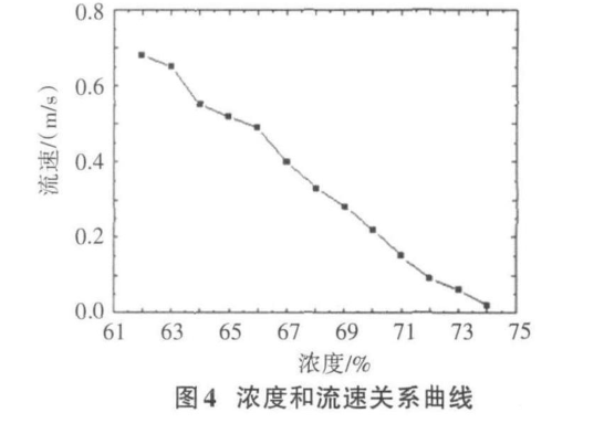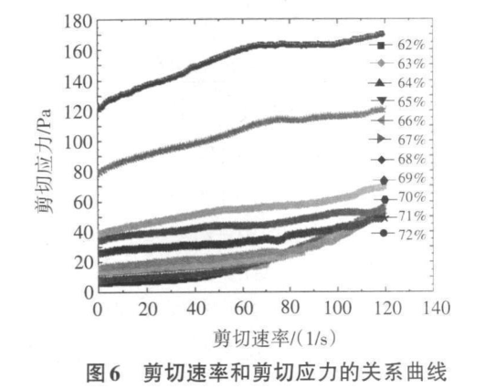 (1)在相同條件下,濃度越大,表觀粘度和剪應(yīng)力也越大坡度隨濃度的增加而增加,且在62%~70%范圍內(nèi),坡度隨濃度緩慢增加,當(dāng)濃度為70%以上時,坡度增長加快。流速和濃度基本呈線性關(guān)系。