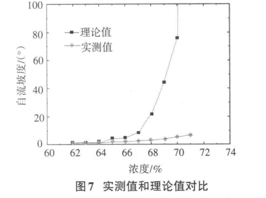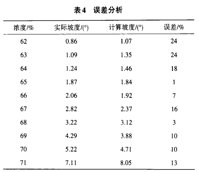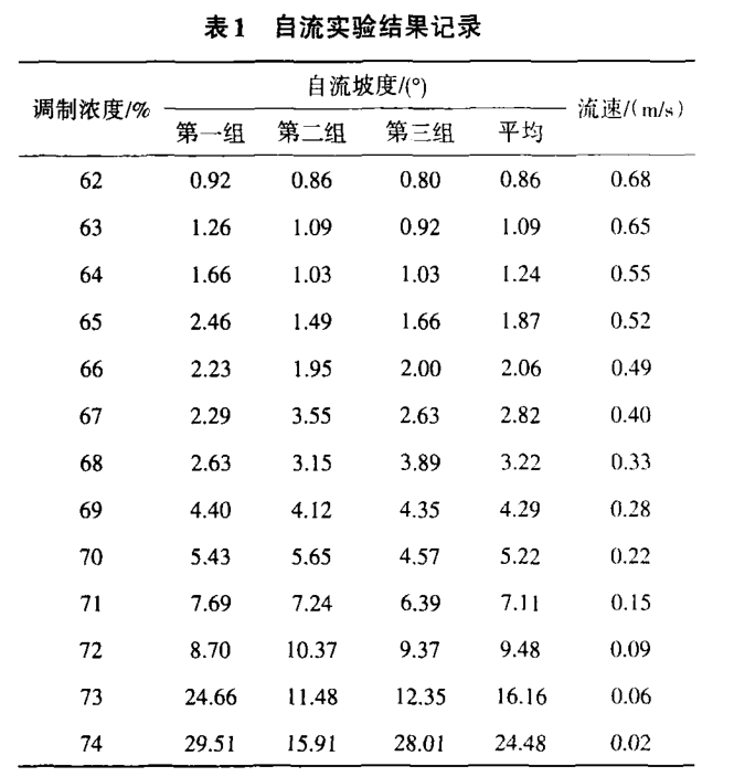 每組濃度進行3次實驗 , 自流坡度取三者的平均值 ,實驗結(jié)果如表1所示 。