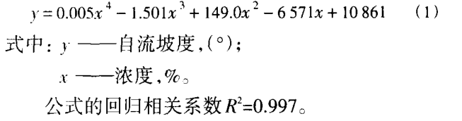 濃度和自流坡度關(guān)系曲線如圖3所示,將數(shù)據(jù)結(jié)果進行回歸分析,得到回歸方程式(1)。 坡度隨濃度的增加而增加 ,且在62%~70%范圍內(nèi)坡度隨濃度緩慢增加。當(dāng)濃度為70%以上時,坡度增長加快,這是膏體粘度增加,流動性減小的緣故。