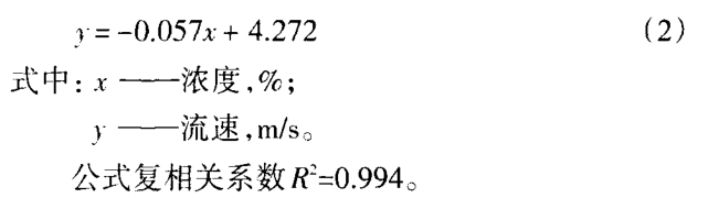 濃度和流速關(guān)系曲線如圖4所示,將,數(shù)據(jù)結(jié)果進行回歸分析,得到回歸方程式(2)。 由式(2)看出在實驗的范圍內(nèi),流速和濃度基本上呈線性關(guān)系,流速隨著濃度的增大而減小 ,這也是濃度越大,流動性越小的緣故。