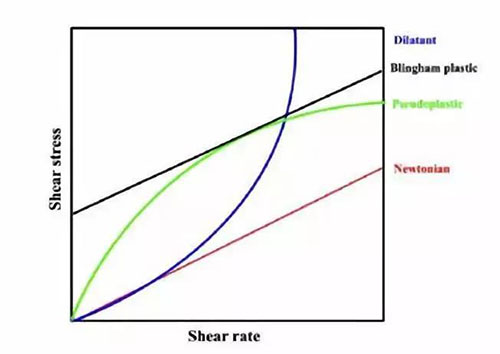 其中,我們最為注重的幾類分別為假塑性流體(下圖綠線)、賓漢流體(下圖黑線)及觸變性流體。