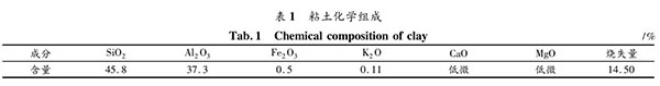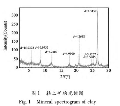 試驗(yàn)使用湖南懷化托口水電站料場(chǎng)粘土,其總體偏酸性,天然含水率在 20 ~30%,塑性指數(shù) >14,液性指數(shù)為 0. 3 ~0. 45,平均比重為2. 73。采用 ICDD 的 K值法對(duì)粘土進(jìn)行定量分析,礦物光譜見(jiàn)圖 1,光譜中埃洛石(Al 2 [Si 2 O 5 ](OH) 4 ·2H 2 O) 的典型特征峰 d =7. 2302,石英(SiO 2 )的典型特征峰 d =3. 3459,埃洛石中礦物含量為 74. 96%,石英含量為 19. 57%。對(duì)粘土進(jìn)行化學(xué)分析,測(cè)得其組分含量見(jiàn)表 1。試驗(yàn)所用水泥為湖南碧螺牌 P·O42. 5 普通硅酸鹽水泥。將粘土浸泡 24 h 以上,用高速攪拌機(jī)攪拌均勻,原漿比重為1. 25。