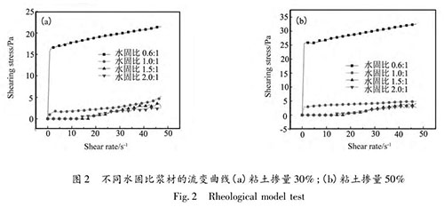 圖 2 可看出,當(dāng)水固比為 0. 6∶ 1 時(shí),粘土水泥漿材具有明顯的屈服應(yīng)力,剪切應(yīng)力隨剪切速率的變化規(guī)律服從線性分布,為賓漢流體;當(dāng)水固比為 1. 0∶ 1 時(shí),漿材仍存在屈服應(yīng)力,屬于賓漢流體;水固比增大到 1.5∶ 1 時(shí)、2. 0∶ 1 時(shí),漿材的流變曲線接近于通過(guò)原點(diǎn)的直線,近似為牛頓流體。