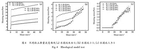 粘土摻量對(duì)漿材流變性能的影響試驗(yàn)中采用 0、10%、30%、50% 四種摻量,水固比 0. 6∶ 1、1. 0∶ 1、1. 5∶ 1三種,溫度取 35 ℃。