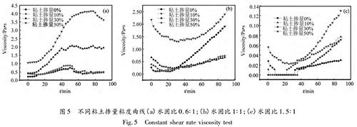 圖 5 可知,水固比為 0. 6∶ 1 時(shí),純水泥漿與粘土摻量 10% 時(shí)漿材粘度隨時(shí)間變化微小;粘土摻量 30%、50%的漿材粘度隨時(shí)間的延長(zhǎng)迅速增大,并在 40 min 處保持穩(wěn)定;水固比為 1. 0∶ 1 時(shí),四種不同粘土比例漿材的粘度值均隨時(shí)間呈先降低后增長(zhǎng)的趨勢(shì),隨粘土比例增大,漿材初始粘度值依次增大;水固比 1. 5∶ 1 時(shí),純水泥漿粘度開(kāi)始保持 0 不變,在 30 min 后逐漸增加,其它各組漿材粘度均隨時(shí)間先降低后增長(zhǎng),除粘土摻量 50%的漿材外,其余各組漿材均出現(xiàn)了粘度為 0 的時(shí)段。漿材粘度隨時(shí)間先降低后增長(zhǎng)的原因可能是:水固比較高時(shí),漿材為不穩(wěn)定漿液,析水分層較快,在析水過(guò)程中漿液粘度會(huì)降低,當(dāng)漿液析水完全后,漿材逐漸膠凝,粘度逐漸增大。