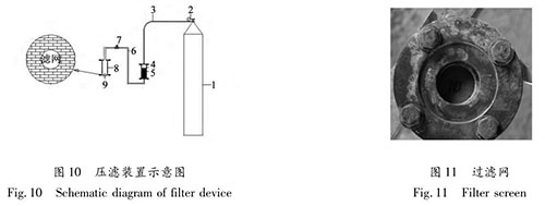 圖 10 中標(biāo)注如下:1-壓力源:為實(shí)驗(yàn)提供氣體壓力,工作壓力 12 ~15 MPa; 2-減壓器:量程為 4 MPa,工作壓力大于 2 MPa;3-輸氣管:連通壓力源與儲(chǔ)漿罐,工作壓力大于 2 MPa;4-儲(chǔ)漿罐:儲(chǔ)存漿液的容器,工作壓力不小于 4 MPa;5-灌漿漿材;6-輸漿管:輸漿管路為鋼絲皮管,工作壓力 4 MPa;7-簡(jiǎn)易閥門(mén);8-壓力容器:其工作壓力不小于 4 MPa;9-過(guò)濾網(wǎng)。