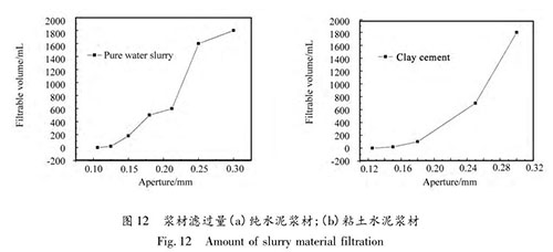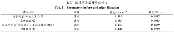 眾所周知,漿材在灌漿過(guò)程中會(huì)發(fā)生壓濾效應(yīng),已有研究成果表明壓濾效應(yīng)會(huì)對(duì)強(qiáng)度產(chǎn)生較大影響 [14] ,而關(guān)于發(fā)生壓濾效應(yīng)后漿材的流變性能的變化卻少有研究。產(chǎn)生壓濾效應(yīng)孔隙大小試驗(yàn)。圖 10、圖 11 為試驗(yàn)裝置圖。表 2 可知,兩種漿材壓濾前后密度、粘度均發(fā)生了變化。粘土水泥漿材的密度變化為 0. 075 kg/m 3 ,粘度變化為 0. 017 Pa·s;純水泥漿材的密度變化為0. 030 kg/m 3 ,粘度變化為 0. 0202 Pa·s。粘土水泥漿材密度變化較大,但粘度變化較小;純水泥漿密度變化較小,但粘度變化較大。圖 12 看出,相同水固比的兩種漿材通過(guò)同一目數(shù)濾網(wǎng)的量不一。濾網(wǎng)孔徑 0. 3 mm時(shí)幾乎全部通過(guò),粘土水泥漿材濾過(guò)量在孔徑 0. 3 ~0. 25 mm 之間大幅下降,而純水泥漿在孔徑 0. 25 ~0. 18mm 之間大幅下降。說(shuō)明同樣空隙的條件下,粘土水泥漿材發(fā)生壓濾效應(yīng)的程度更重。