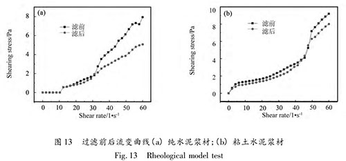 壓濾效應(yīng)前后的流變性能對(duì)比試驗(yàn)。對(duì)純水泥漿選取孔徑 0. 212 mm 的濾網(wǎng)進(jìn)行過(guò)濾,對(duì)粘土水泥漿選取孔徑 0. 25 mm 濾網(wǎng)進(jìn)行過(guò)濾。從圖 13 可知,純水泥漿材在濾過(guò)前后均為具有剪脹性的冪律流體,濾過(guò)前呈現(xiàn)出剪脹特性;粘土水泥漿材的流變曲線變化微小。漿材的壓濾作用對(duì)流變參數(shù)有影響,壓濾對(duì)粘土水泥漿的流變特性影響較純水泥漿小。