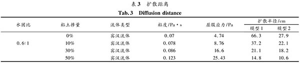 為研究流變性對(duì)擴(kuò)散距離的影響,引用前人研究的成果分析漿材流變特性對(duì)擴(kuò)散半徑的影響 [15-18] 。以水固比 0. 6∶ 1 的漿材為例,計(jì)算結(jié)果見(jiàn)表 3。可得出以下結(jié)論: