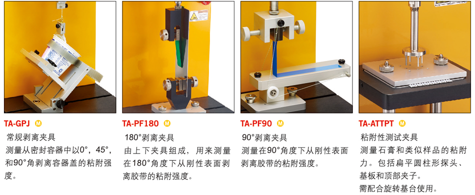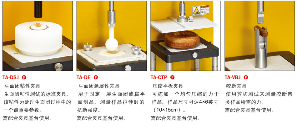 樣品在質(zhì)構(gòu)分析過程中,選擇探頭的幾何形狀十分關(guān)鍵。一個大 角度的圓錐探頭比小角度的圓錐探頭需要用更大的力來驅(qū)動;同 樣,用大直徑的圓柱型探頭比用小圓柱型探頭需要用更大的力 探頭夾具的選擇會直接影響測試結(jié)果。