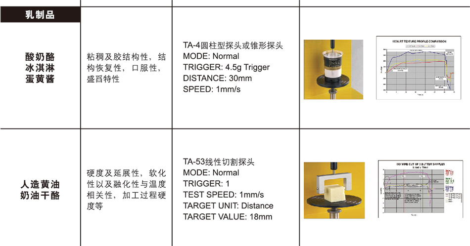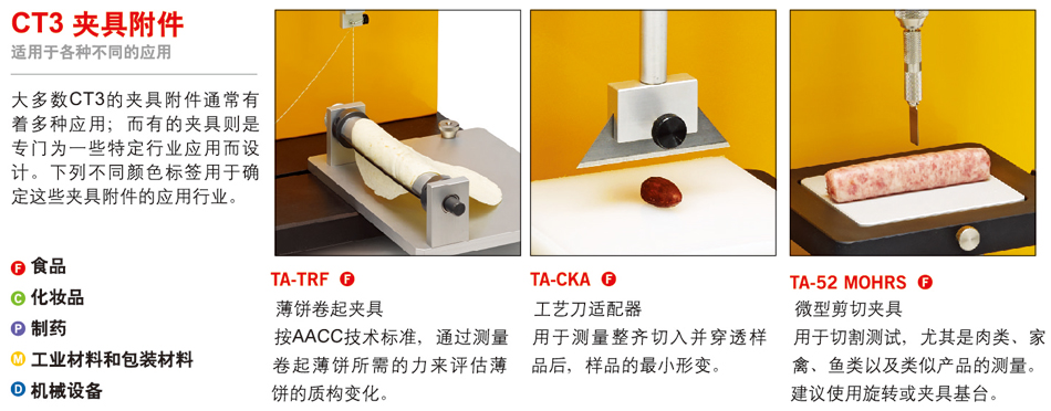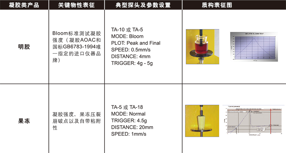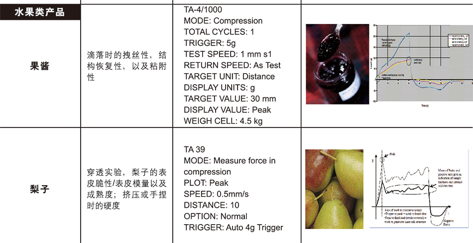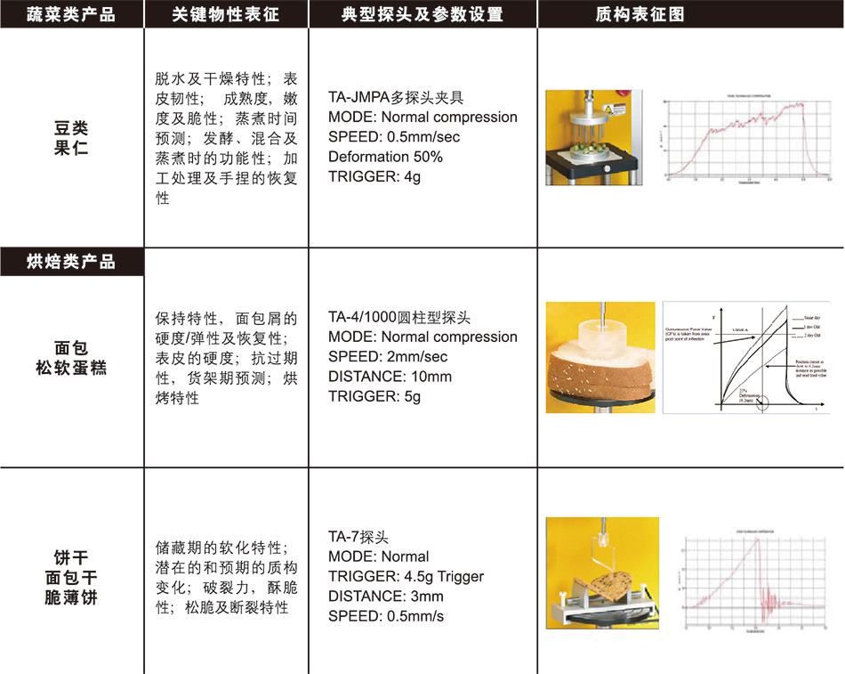 可應(yīng)用于肉制品、糧油食品、面食、谷物、糖果、果蔬、凝膠果醬等食品的物性學(xué)分析;可以分析食品的嫩度、硬度、脆性、粘性、彈性、內(nèi)聚性、咀嚼性拉伸強(qiáng)度、抗壓強(qiáng)度、穿透強(qiáng)度等各項物性指標(biāo)。還可用于個人護(hù)理品、膠類(明膠/果膠等)藥品膠囊、民用和工業(yè)粘結(jié)材料(膠粘劑樹脂)等行業(yè)