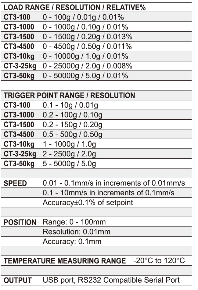 質(zhì)構(gòu)儀CT3測量參數(shù)