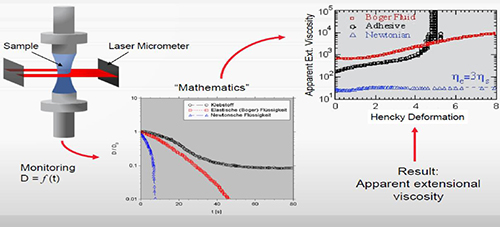 在傳統(tǒng) CaBER 試驗中,往往使用激光測微尺,對上下兩板之間形成的(圓柱形)流體細絲,進行由表面張力誘導的細化(隨時間變化)測量,然后使用測得數(shù)據(jù)算出拉伸粘度數(shù)據(jù)。