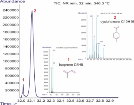 在 NR 分解的起始點(32min,346.3°C),主要的揮發(fā)產(chǎn)物為 isoprene C5H8(TIC 色譜圖的峰1),以及 1-methyl-4-(1-methylethenyl)-cyclohexene C10H16(峰 2)。