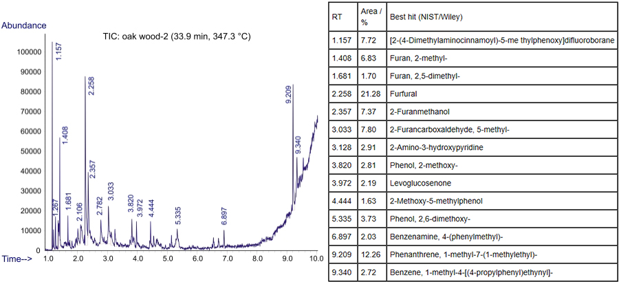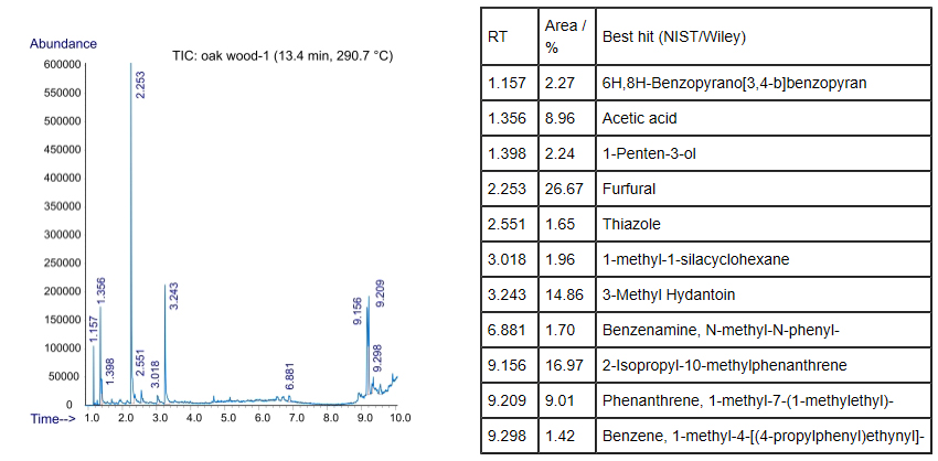 橡樹木熱裂解過程第一階段的總離子色譜圖,以及相關(guān)主峰的譜庫搜索結(jié)果如下(下表以滯留時間(RT/min)的升序排列):
