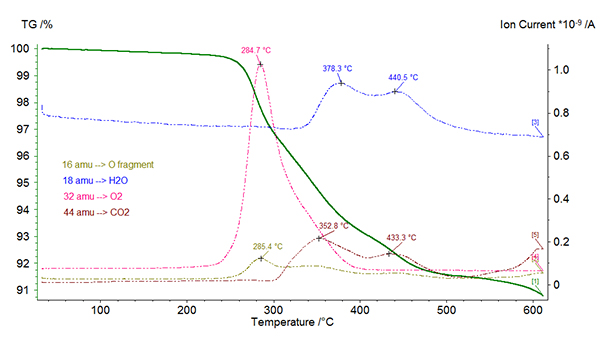 在本例中,經(jīng)過(guò)脫鋰的鈷酸鋰材料從紐扣電池中取出,放入 NETZSCH STA449F1 Jupiter 與 QMS 403 Aeolos Quadro 聯(lián)用設(shè)備中進(jìn)行分析。正極材料在升溫過(guò)程中顯示有幾個(gè)離散的分解臺(tái)階。在聯(lián)用質(zhì)譜的幫助下,可以很容易地理解材料的分解路徑,以及正極材料經(jīng)過(guò)循環(huán)后的深層結(jié)構(gòu)變化。
