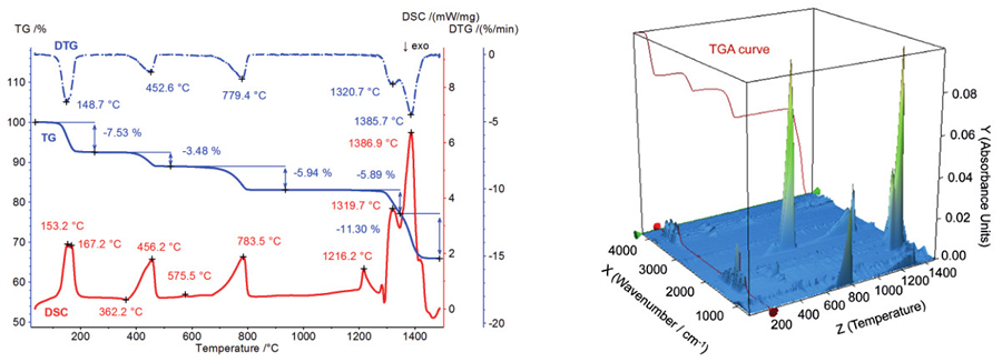 下圖所示為整個(gè)加熱過(guò)程中的 TGA 與 DSC曲線。TGA 曲線中出現(xiàn)了若干個(gè)失重步驟,其對(duì)應(yīng)的 DSC 峰分別是在 150℃、453℃、779℃ 附近,最后的失重峰出現(xiàn)在 1300℃ 與 1400℃ 之間。在 DSC 曲線上,還出現(xiàn)了幾個(gè)額外的小峰:362℃ 出現(xiàn)了一個(gè)小的放熱峰,576℃ 出現(xiàn)了一個(gè)小的吸熱峰。1216℃ 出現(xiàn)了一個(gè)大的吸熱峰。從熱重及 DSC 曲線上能夠看出,各組分之間并沒(méi)有相互作用,每個(gè)材料都體現(xiàn)了各自的轉(zhuǎn)變和分解效應(yīng)。只有當(dāng)溫度高于 1260℃ 時(shí),所觀察到的分解可能疊加了其他材料的熔融。STA 與 FT-IR 相結(jié)合有助于此類(lèi)復(fù)雜曲線的解釋。