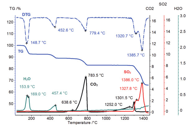 STA-FT-IR 實(shí)驗(yàn),TGA 曲線(藍(lán)色),DTG 曲線(藍(lán)虛線),二氧化碳(黑色),水(青色),二氧化硫(紅色)