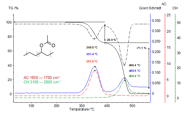在下圖中顯示了 TGA 曲線(黑色),DTGA 曲線(黑色點(diǎn)劃線)和 Gram-Schmidt 譜圖(藍(lán)色)。另外兩個(gè)的提出曲線(吸收強(qiáng)度隨溫度變化曲線;紅線和綠線)和DTGA曲線有很好的相關(guān)性。在 350°C 的第一個(gè)失重步驟是由于乙烯的揮發(fā)(紅色曲線)。在第二個(gè)失重步驟中,乙烯已經(jīng)完全揮發(fā)。綠色的曲線表示了由于聚合物主鏈分解而釋放出的碳?xì)浠衔锏奈諒?qiáng)度變化過程(DTGA 峰值為468°C)