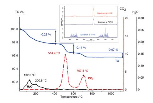 熱重曲線顯示了多個(gè)失重步驟。在 400°C 以前,幾個(gè)失重步驟均有較小的重疊,接下來的兩個(gè)失重臺(tái)階分離的很好,其 DTG 峰值溫度分別為 510°C 與 705°C。樣品至1100°C的總失重量為 0.43%。紅外譜圖顯示水和二氧化碳為主要的氣體產(chǎn)物。