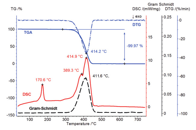 上圖中,藍(lán)色實(shí)線為熱重曲線,藍(lán)色虛線為 DTG 曲線,紅色為 DSC 曲線,黑色虛線為 FT-IR 曲線(Gram-Schmidt圖)。