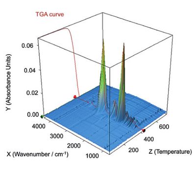 三維的紅外譜圖包含了溫度坐標(biāo)(Z 軸)與 TGA 曲線,為樣品的熱裂解分析提供了另一個(gè)有力的證據(jù)。
