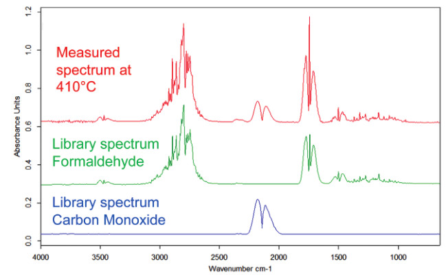為確定逸出氣體的成分,從三維譜圖中提取出 410℃ 下的二維譜圖(紅色),與紅外數(shù)據(jù)庫中的標(biāo)準(zhǔn)譜圖進(jìn)行比對(duì),比對(duì)結(jié)果表明氣體成分為甲醛(綠色標(biāo)準(zhǔn)譜圖)和 CO(藍(lán)色標(biāo)準(zhǔn)譜圖)。