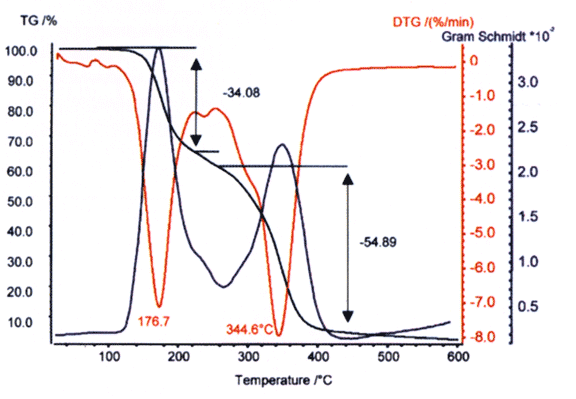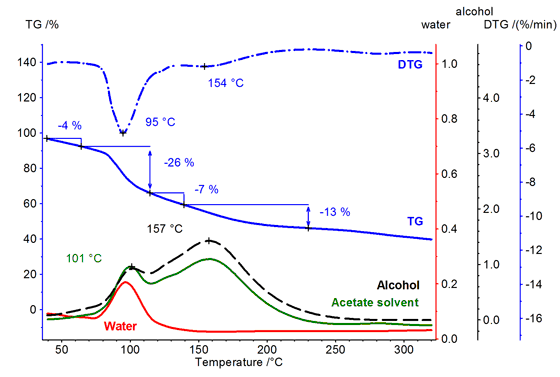 稱取 31.9mg 的雙組份水性清漆樣品,用 TG209F1 Libra-FT-IR 聯(lián)用系統(tǒng)進(jìn)行分析。樣品在氮?dú)鈿夥罩幸?5K/min 升溫至 300℃,氮?dú)饬魉?45ml/min。到達(dá) 100℃ 時樣品的主要失重是由于水的揮發(fā),但還有一部分是來自于烴類物質(zhì),如乙酸烷基酯和脂肪族醇。軌跡圖上兩個峰顯示這些組分最大揮發(fā)速率在 154℃。因此,在這種水性清漆的干燥過程中,沒有跡象顯示有毒氣體產(chǎn)生。