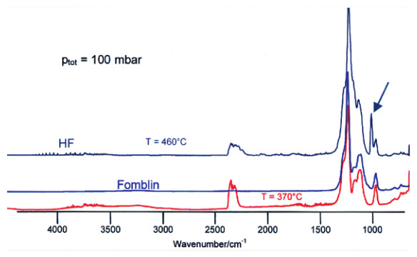 當(dāng)揮發(fā)物的沸點(diǎn)溫度遠(yuǎn)高于傳輸管線的加熱溫度時,這些揮發(fā)物的檢測需要特殊的條件。耐馳的熱紅聯(lián)用系統(tǒng)為真空密閉設(shè)計,能在低壓下進(jìn)行測試。通過這種方式,揮發(fā)樣品的沸點(diǎn)溫度會降低,使其可以通過傳輸管線而沒有任何損失,可用來檢測聚合物和橡膠中高沸點(diǎn)的增塑劑,如下面全氟化 O 型圈中 Fomblin® 的檢測。熱重與整個氣路系統(tǒng)的壓強(qiáng)控制在 100mbar,在370℃ 增塑劑 Fomblin 揮發(fā),與其純物質(zhì)的紅外譜圖比對可進(jìn)行確認(rèn)。在更高溫度(460℃),還可以檢測得到聚合物的分解產(chǎn)物如 HF 和其他產(chǎn)物,下圖箭頭所標(biāo)識的吸收峰為 HF 的典型吸收。