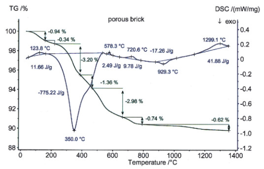 下圖可見,在傳統(tǒng)的粘土磚中有機(jī)物的燒失伴隨大量的放熱(775J/g)。粘合劑燒失過程中,水與 CO2 為主要產(chǎn)物,但是熱紅聯(lián)用系統(tǒng)能清晰地檢測到粘土中 HF 與 SO2 的揮發(fā)。對揮發(fā)產(chǎn)物的檢測,有助于從經(jīng)濟(jì)與生態(tài)環(huán)境的角度來優(yōu)化燒結(jié)過程。