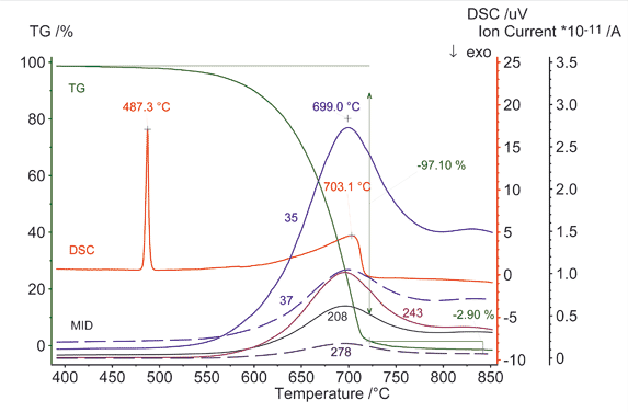 將 7.92mg 氯化鉛在 150ml/min 的氬氣氣氛中進行升溫測試,圖中顯示了起始于熔融范圍(487°C)的揮發(fā)過程。由分裂與離子化(PbCl m/z = 243, Pb m/z = 208, Cl m/z = 37, CL m/z = 35)產生的分子離子(PbCl2 m/z = 278)與碎片離子能夠在遠低于原料的沸點以下就清晰地檢測到。