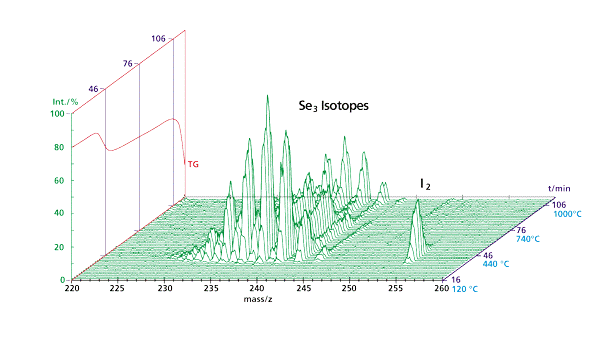 元素碘的出現是作為合成過程中的礦化劑。在溫度高于 900°C 下檢測到元素硒 Se,這是由于 CuGaSe2 分解所致。調節(jié) Se 的蒸氣壓可以控制合成化學計量比(使用 QMS 403/5 Skimmer 測試)。