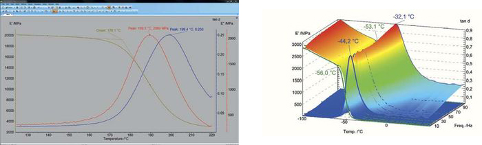 圖譜表明,這是一個(gè)典型的玻璃化轉(zhuǎn)變行為。儲(chǔ)能模量 E' 在 -40℃ 時(shí)迅速下降,E'' 則出現(xiàn)了一個(gè)明顯的峰。玻璃化轉(zhuǎn)變和振動(dòng)頻率呈明顯的依賴關(guān)系:頻率越高,玻璃化轉(zhuǎn)變溫度越高。