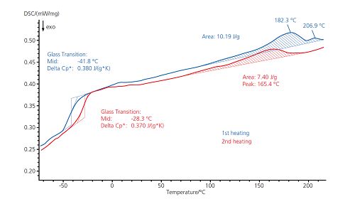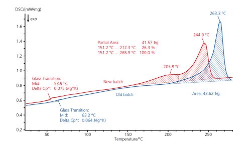 圖中顯示了看似相同的兩種顆粒的 DSC 曲線,樣品為 PA66,分別在不同時間交付(以 20K/min 的速率降溫后二次升溫)。藍(lán)色曲線(舊樣)上在 63°C 出現(xiàn)玻璃化轉(zhuǎn)變,263°C 出現(xiàn)熔融峰,均為 PA66 的典型表現(xiàn)。在新料(紅色曲線)上則出現(xiàn)了雙峰,峰值溫度為 206°C 和 244°C。這表明新料中可能存在與 PA66 共混的第二種聚合物。