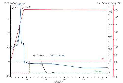 OIT 測試(氧化誘導(dǎo)時間)是用于評價聚合物特別是聚烯烴耐氧化性的常用測試方法。在這個例子中,兩個 PP 樣品在動態(tài)氮氣氣氛下加熱到 200°C。在加熱過程中檢測到的吸熱峰對應(yīng)于聚丙烯的熔融。在 200°C 恒溫 3 分鐘,將氣體切換至空氣。其后出現(xiàn)的放熱效應(yīng)為聚合物的氧化分解。此例中,樣品A(OIT 6.6分鐘)比樣品B(OIT 11.6分鐘)更早的發(fā)生了氧化反應(yīng)。
