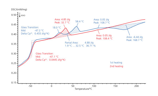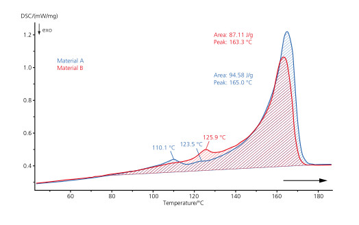 通過二次升溫曲線可做進(jìn)一步驗證,除了 165℃ 和 163℃ 的吸熱峰(PP材料典型的熔融峰),藍(lán)色曲線在 110℃ 和 124℃ 還有兩個吸熱峰,說明材料 A 中還含有 LDPE、LLDPE 或 HDPE(熔融溫度隨密度增大而升高)等額外的組分。相反,材料 B 中僅在 126℃ 有一個小的吸熱峰。