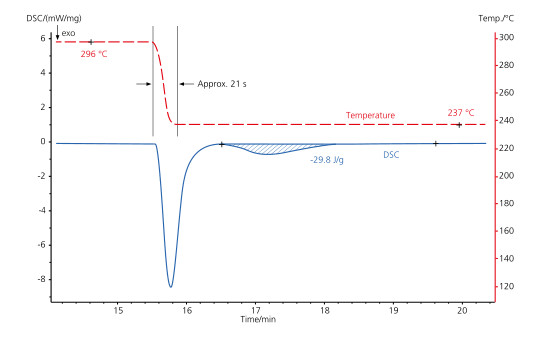 DSC 214 Polyma 配合 IC70 機(jī)械制冷,測試 PA66 GF30(30%wt 玻璃纖維)的等溫結(jié)晶過程。較低的爐體熱質(zhì)量,使得爐腔內(nèi)部可在幾秒內(nèi)實現(xiàn) 60℃ 的降溫。在這個前提下,才有可能將 PA66 的結(jié)晶過程(17min 附近的結(jié)晶峰)和溫度調(diào)整引起的曲線波動(15.4min 至 16min 之間的曲線波動)分開。同時從溫度曲線可見,在急速降溫時溫度過沖極小,說明 DSC214 Polyma 具有杰出的冷卻性能。