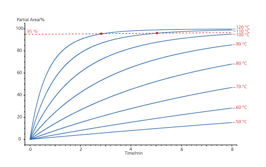 下圖顯示的是不同溫度下恒溫時樣品的固化度隨時間的變化,由軟件基于動力學(xué)模型計算得到。在 120℃ 下恒溫 3min,樣品的固化度即達(dá) 95%,而在 110℃ 下達(dá)到同等固化程度需要恒溫 5min 以上。