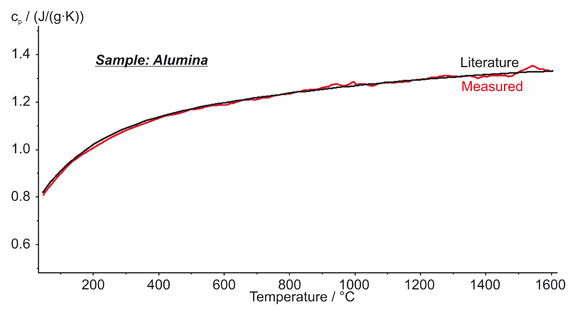 圖中所示為在室溫至1600°C的溫度范圍內(nèi)對(duì)多晶氧化鋁樣品的比熱測(cè)量結(jié)果,同時(shí)給出了純氧化鋁的比熱文獻(xiàn)值曲線。能夠清楚地看到在文獻(xiàn)值與測(cè)量值之間差別很小,最大偏差在 2% 范圍內(nèi),這充分顯示了 DSC 404 F1 Pegasus® 的優(yōu)異的比熱測(cè)量精度。