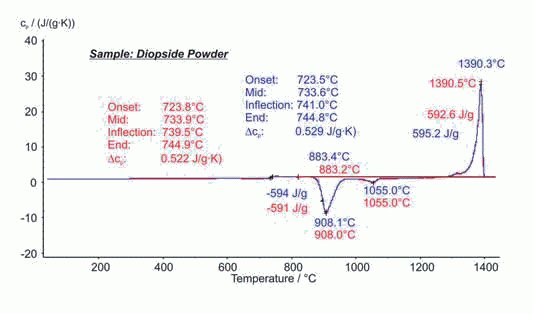 圖中顯示的是透輝石玻璃粉末兩次測(cè)試的結(jié)果。玻璃化轉(zhuǎn)變發(fā)生在723°C~745°C之間,重結(jié)晶出現(xiàn)在883°C(起始點(diǎn)),熔融出現(xiàn)在1390°C(主峰溫度)。兩次測(cè)試分別取樣,得到的數(shù)據(jù)包括特征溫度和相應(yīng)的熱焓計(jì)算都吻合的很好,而且兩次測(cè)試過程中樣品比熱也基本無差別。這說明DSC 404 F1 Pegasus? 具有非常出色的穩(wěn)定性和測(cè)試重復(fù)性。