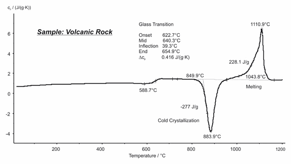 巖石作為一類化學(xué)組成非常復(fù)雜的天然材料的泛稱,一般很難進(jìn)行分析。這類材料通常是多種多樣的氧化物,硫酸鹽或碳酸鹽的混合物?;鹕綆r通常由熔融巖漿凝固而成,其主成分為多種氧化物。本例顯示了對(duì)于某種巖石材料的 DSC 測(cè)量結(jié)果。玻璃化轉(zhuǎn)變發(fā)生在 623°C 至 655°C 之間,在 884°C 與 1111°C 分別檢測(cè)到了冷結(jié)晶與熔融峰(均取峰值溫度)。冷結(jié)晶的放熱熱焓與熔融的吸熱熱焓相近,證明了該混合物接近于完全的無定形材料。